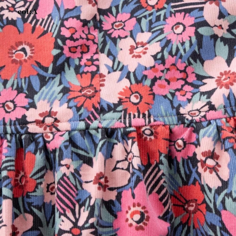 柔らかな手触りのコーデュロイに、ボヘミアン調の花々を鮮やかな色彩で描いたリバティプリント生地のドレス。