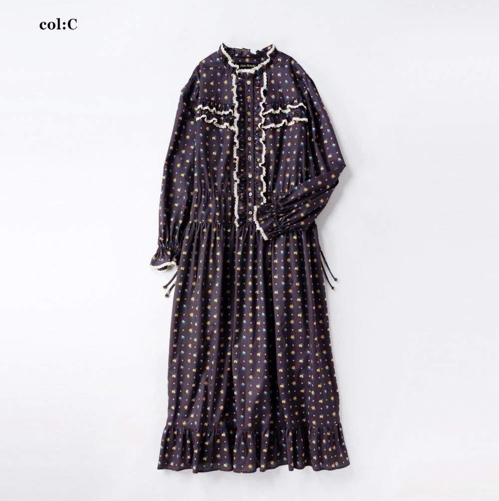 国産トーションレースの縁取りを施した立体的なフリルを衿、前身頃、袖口に飾ったルックスは、ブランドならではのエレガントなドレススタイル。