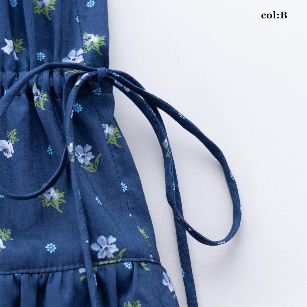 ウエストは小花を描いた玉つきのドローストリングリボンで調節ができる仕様。